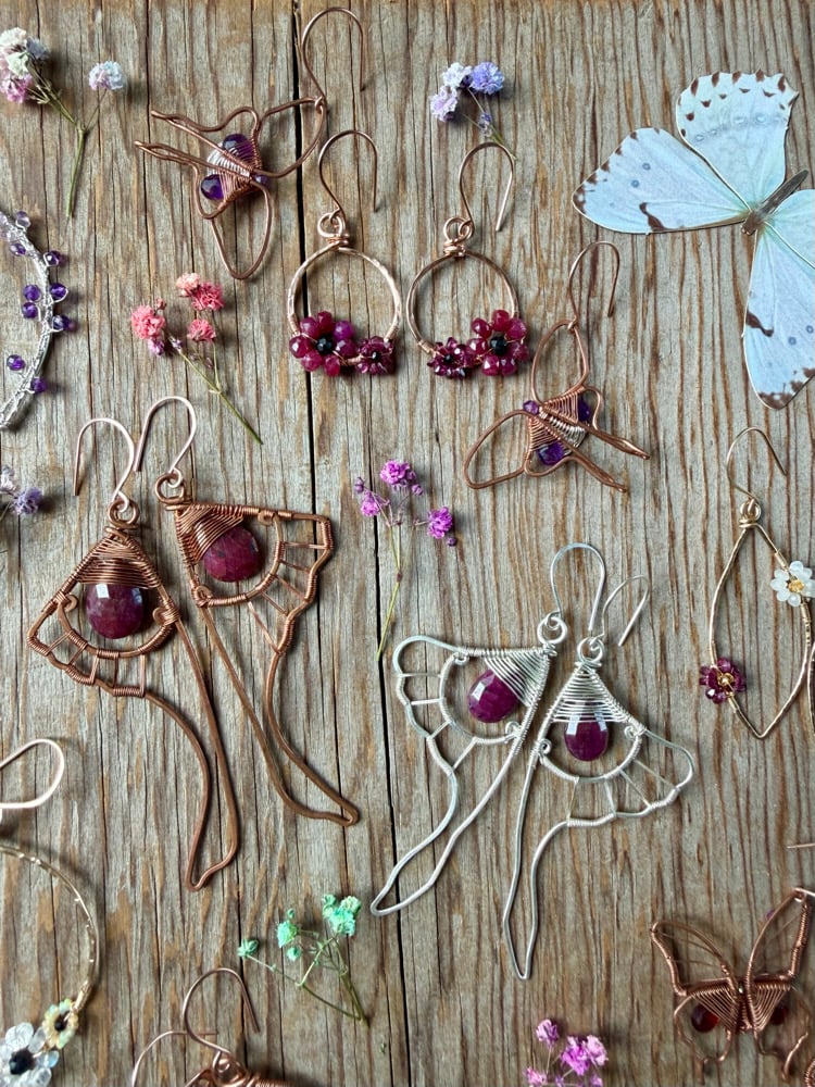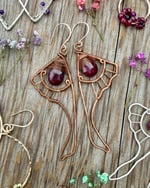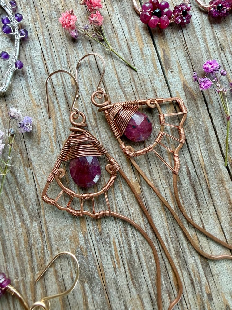 These statement earrings carry all the vibes of whimsy! These Wings have been hand shaped from Copper with 14KT Rose Gold fill ear hooks for metal sensitivities. The wings have been hammered for strength and a delicate texture. Firmly woven in the center of each wing is a faceted 20mm x 15mm Ruby. This gemstone is completely natural and not treated whatsoever.