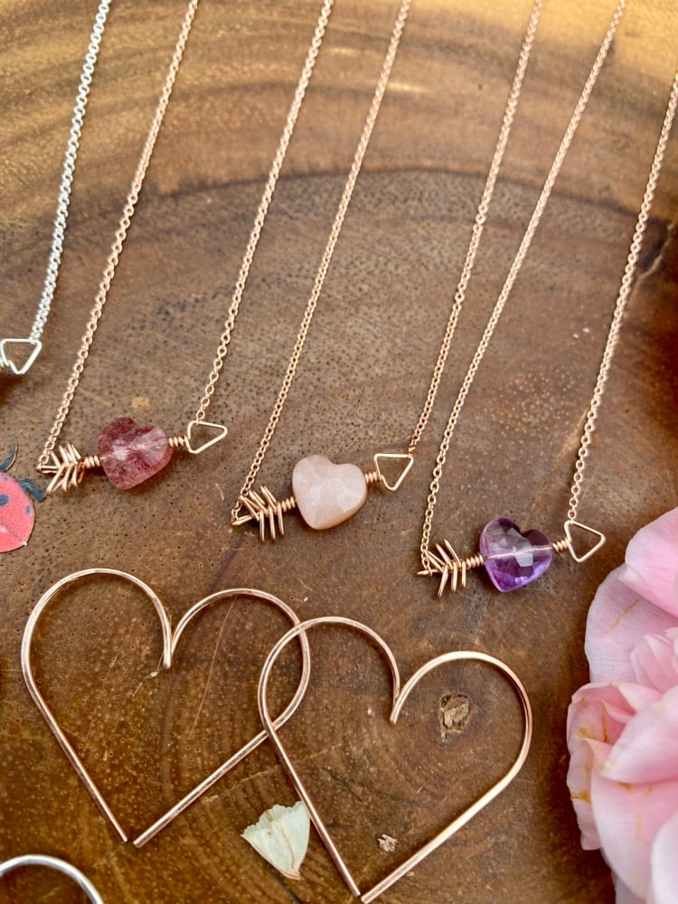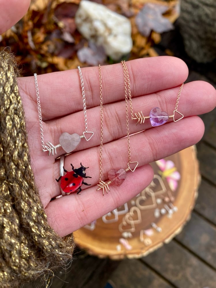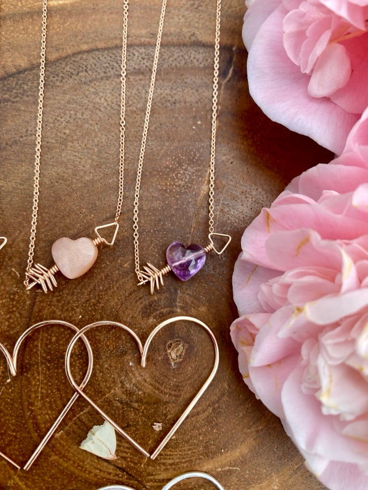 🍓Cupids Amethyst Necklace is a sweet way to remind yourself or one you care for that you are loved. A dainty 8mm x 8mm heart rests in the center of a hand wrapped wire arrow. The heart is completely natural Amethyst with no treatments whatsoever. Choose between Sterling Silver or 14KT Rose Gold fill chain at either 16” or 18” length. Feel free to reach out to me about necklace length or any other jewelry questions/inquiries.