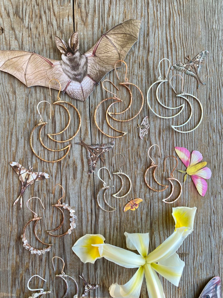 The Large Cratered Moon Earrings are the perfect daily wear for you natural mystics. I hand shape Sterling Silver, Rose Gold fill, or Gold fill metal before hammering it with a round, crater like texture. These earrings are simple, yet their bold size makes sure they are seen. They are about the size of a silver dollar.
