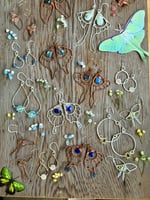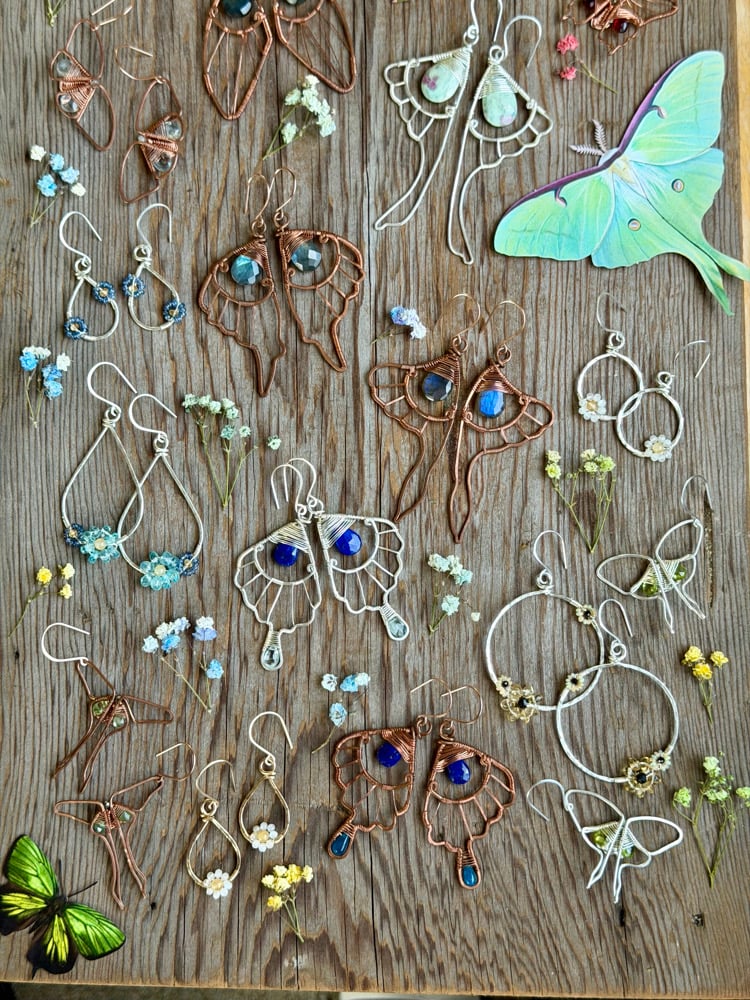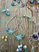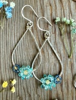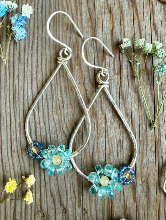 These Spring Bouquet Earrings express a bold yet delicate energy. The thick teardrop frame is hand shaped from Sterling Silver and hammered for strength and texture. Elegantly weaved to the bottom of each teardrop is a larger Blue Apatite flower and a smaller Blue Sapphire flower. Each flower has a Citrine center. The Blue Apatite is completely natural with no treatments whatsoever. The Blue Sapphire and Citrine is a natural stone that has been heated for color enhancement. All gemstones used are B Grade.