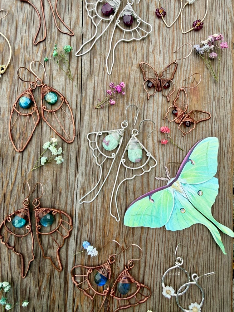 These statement earrings carry all the vibes of whimsy! These Wings have been hand shaped from Sterling Silver, and hammered for strength and a delicate texture. Firmly woven in the center of each wing is a faceted 20mm x 15mm Ruby in Fuchsite. This gemstone is completely natural and not treated whatsoever. These earrings are incredibly unique, as this is my own personal design.
