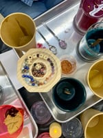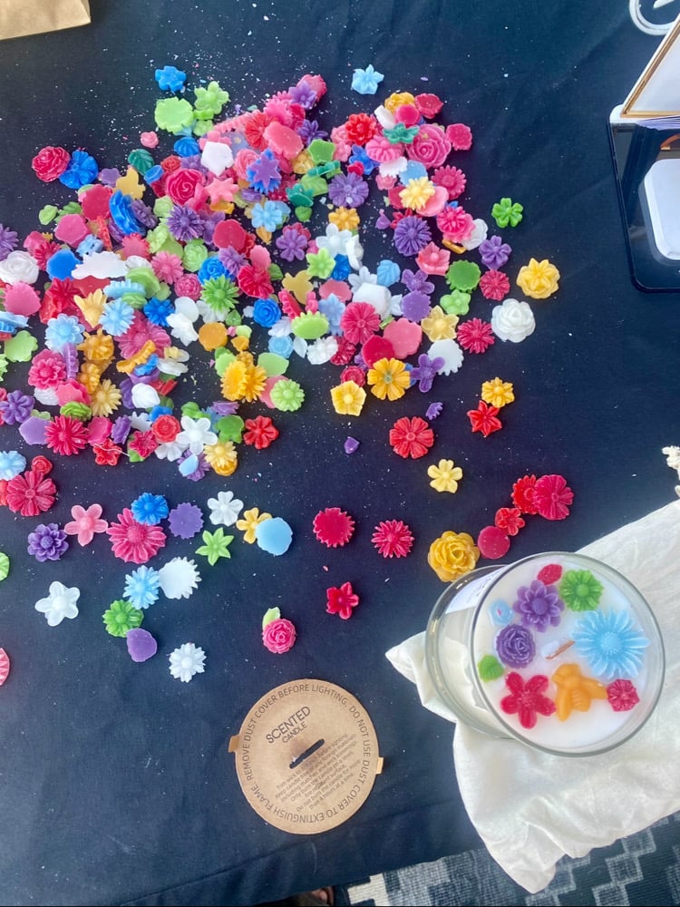 🕯️FOR YOUR CANDLE- Each participant will receive a 9oz. glass vessel, crackling wick, and your own signature label. Get creative by adding color to your candle wax, and even further by decorating the top of your candle. Handmade beeswax flowers and natural gemstone chips will be available for you to embellish your candle tops.