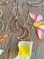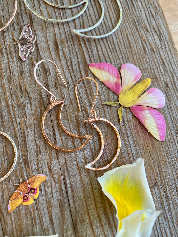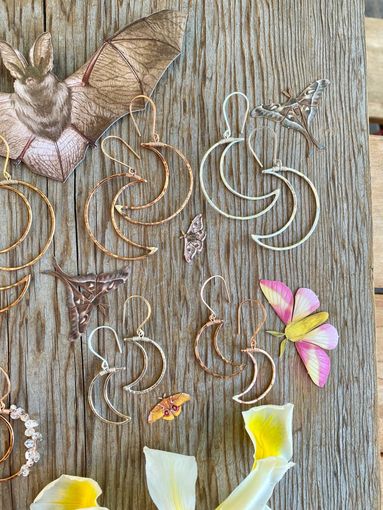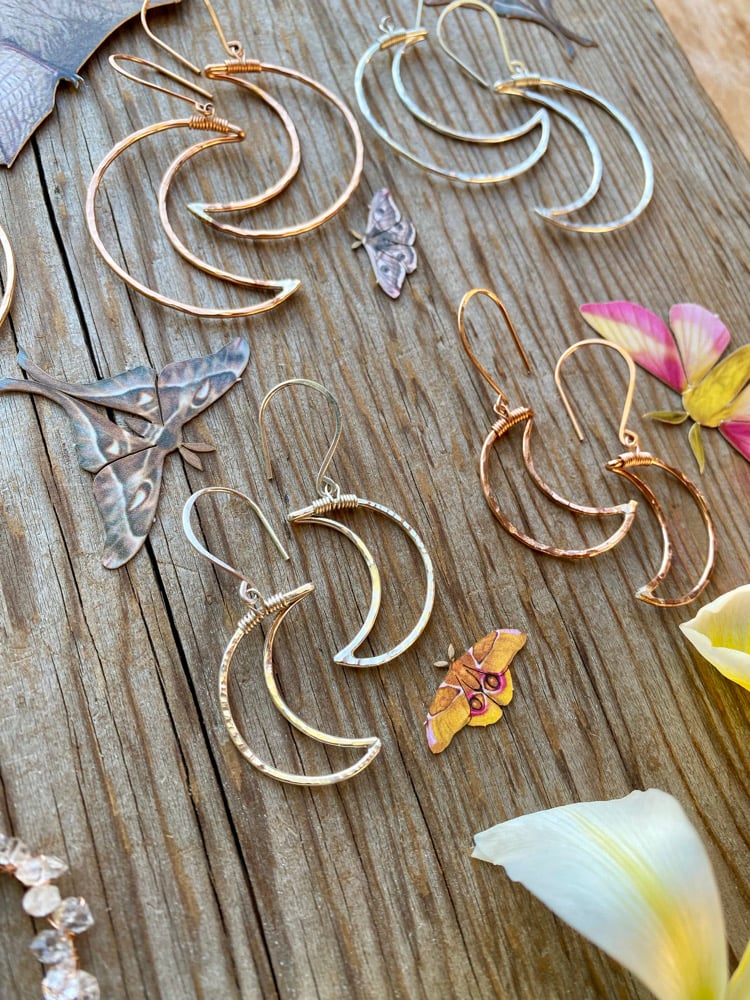 The Small Cratered Moon Earrings are the perfect daily wear for you natural mystics. I hand shape Sterling Silver, Rose Gold fill, or Gold fill metal before hammering it with a round, crater like texture. The Moons are about the size of a quarter.