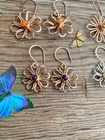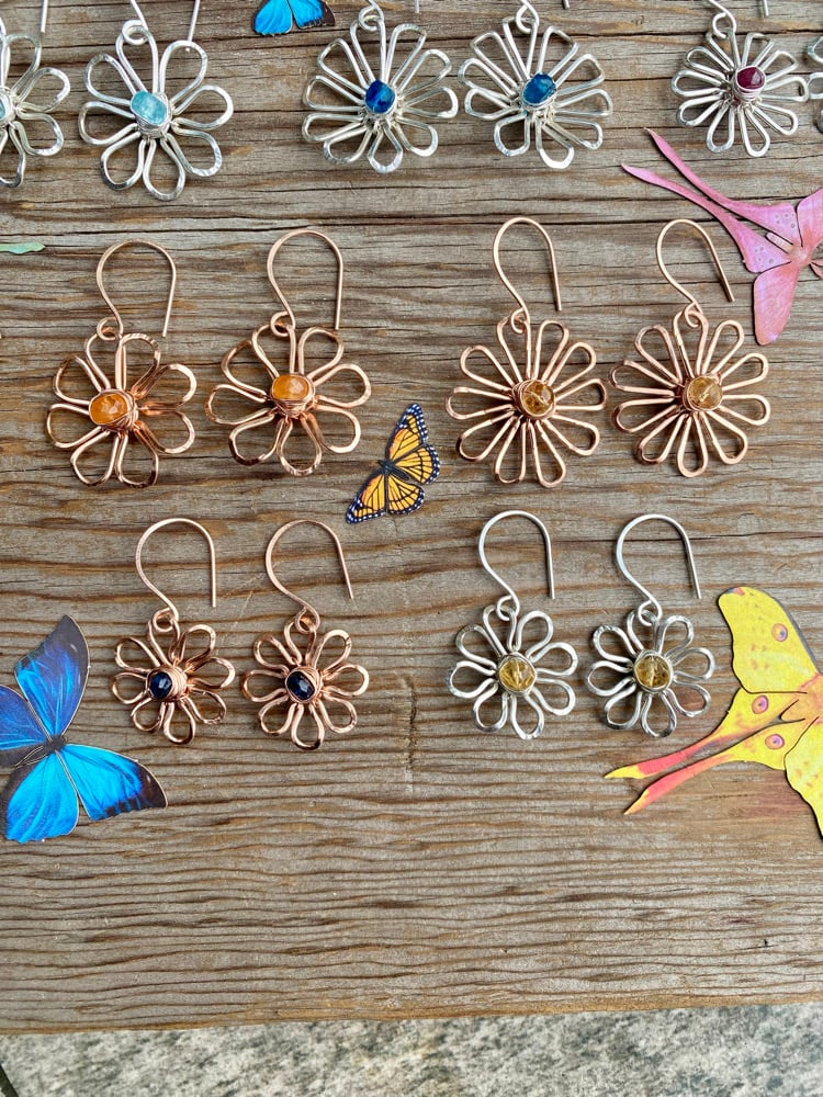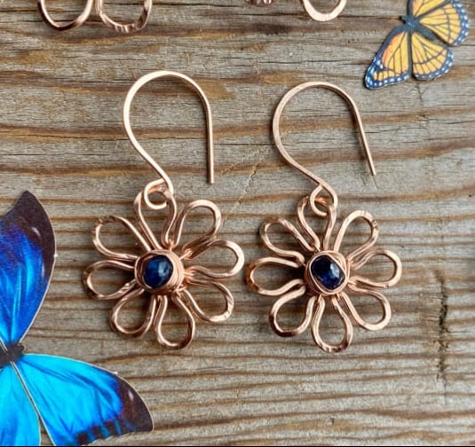 Wear the Sapphire Bloom Earrings for maximum flower power! I hand shaped each petal with 14KT Rose Gold fill metal before hammering and shaping these flowers into life. Each flower has a faceted Blue Sapphire wrapped to its center. The Sapphire is a B Grade natural gemstone that has been heat treated for color enhancement.