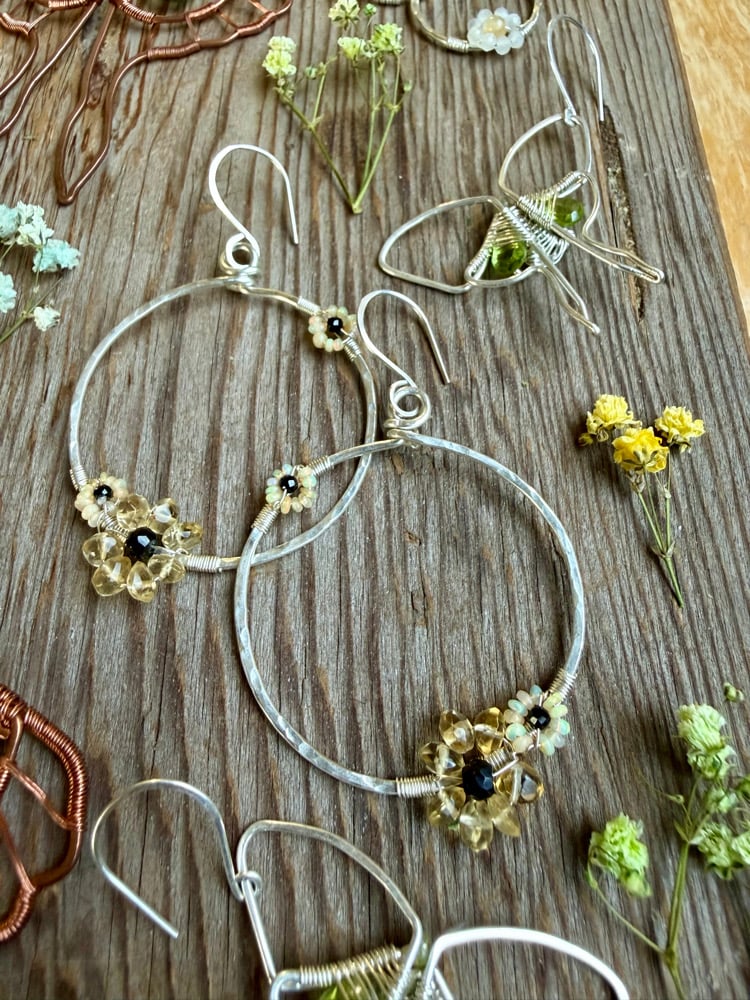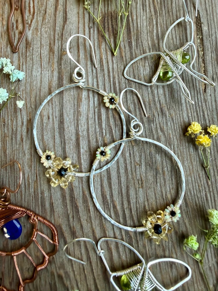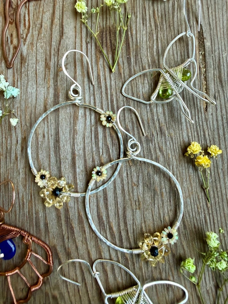 These Spring Bouquet Earrings express a bold yet delicate energy. The thick Circular frame is hand shaped from Sterling Silver and hammered for strength and texture. Elegantly weaved to the each circle is one larger Citrine flower and two smaller Opal flowers. Each flower has a Spinel center. The Opal and Spinel is completely natural with no treatments whatsoever. The Citrine is a natural stone that has been heated for color enhancement. All gemstones used are B Grade.
