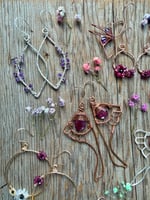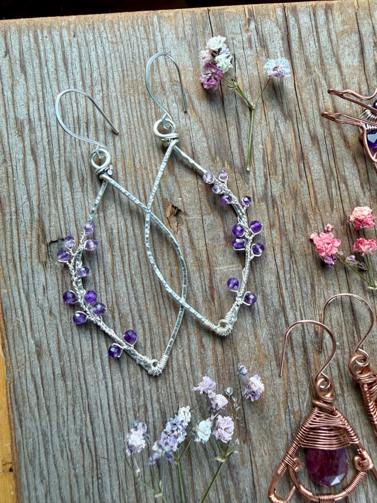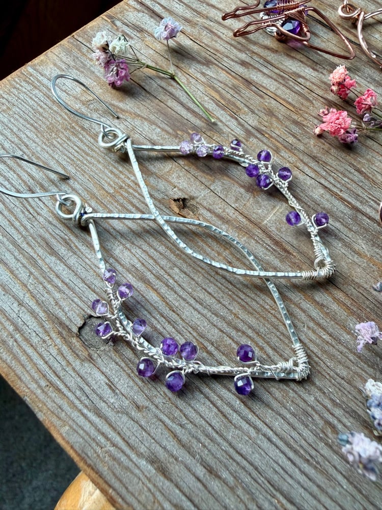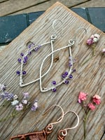 The Lavender Sprig Earrings express a bold yet delicate energy. The thick diamond frame is hand shaped from Sterling Silver and hammered for strength and texture. Elegantly weaved to the side of each diamond is a tiny weaved lavender sprig with Amethyst petals. The Amethyst is B Grade and completely natural with no treatments whatsoever.