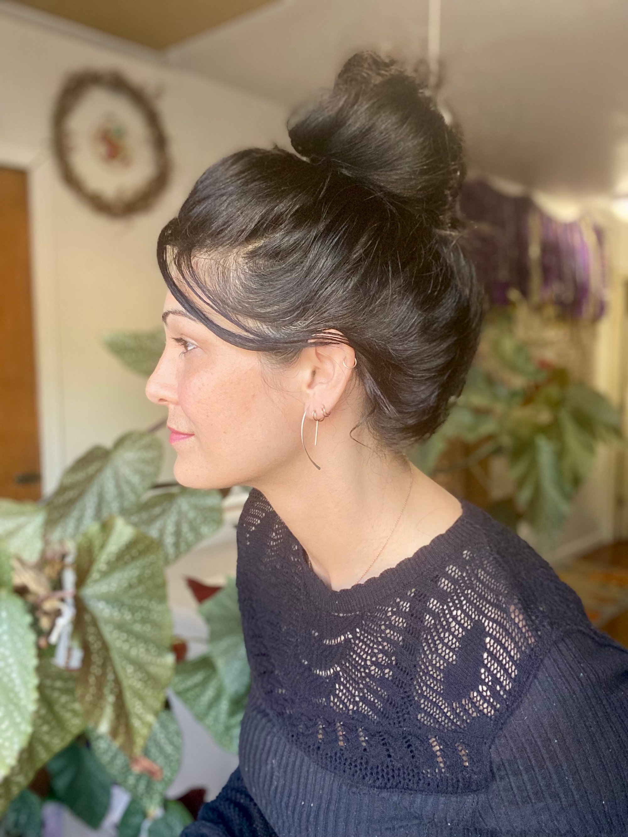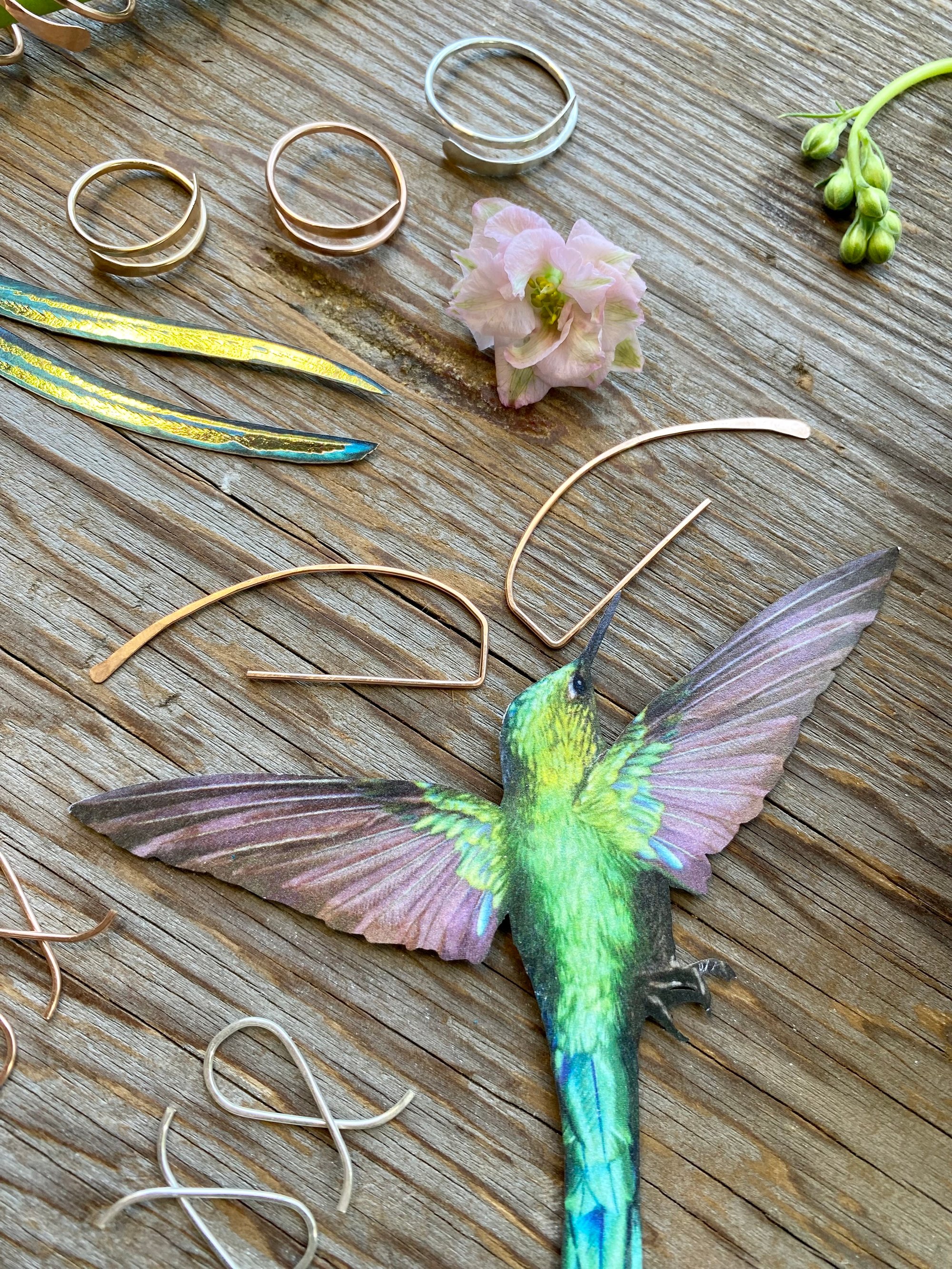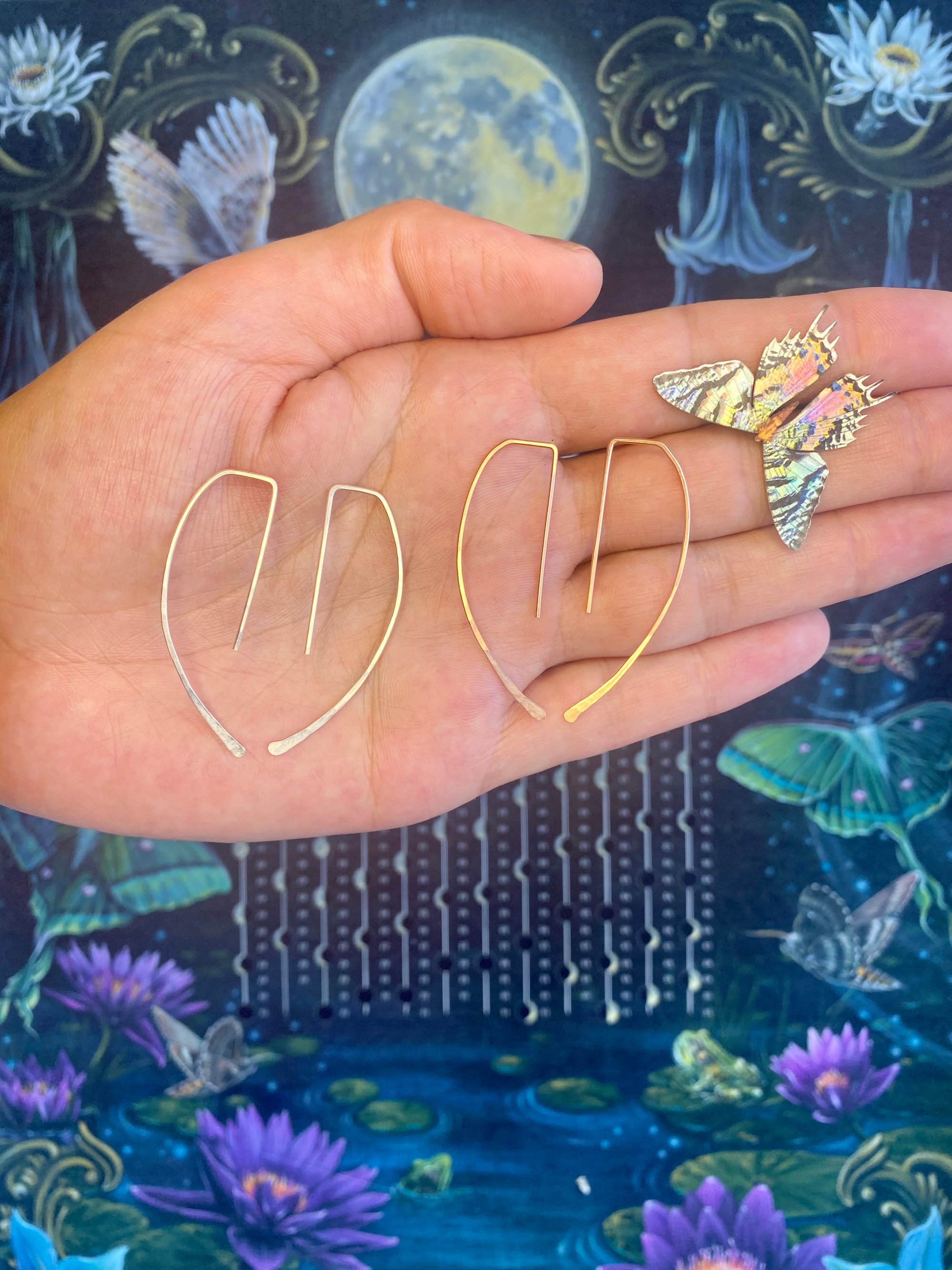 The Wings Threader is created to be an easy to wear double sided earring. I hand shape either Sterling Silver or 14kt Rose Gold fill wire into a half hoop shape before lightly hammering a gorgeous texture to the metal. The wings beautifully curve around your ear lobes at 1- 3/4 inch from the ear and are about 2 cm at the widest point. To wear gently insert the shorter side of the earring into your piercing and pull until it sits comfortably.